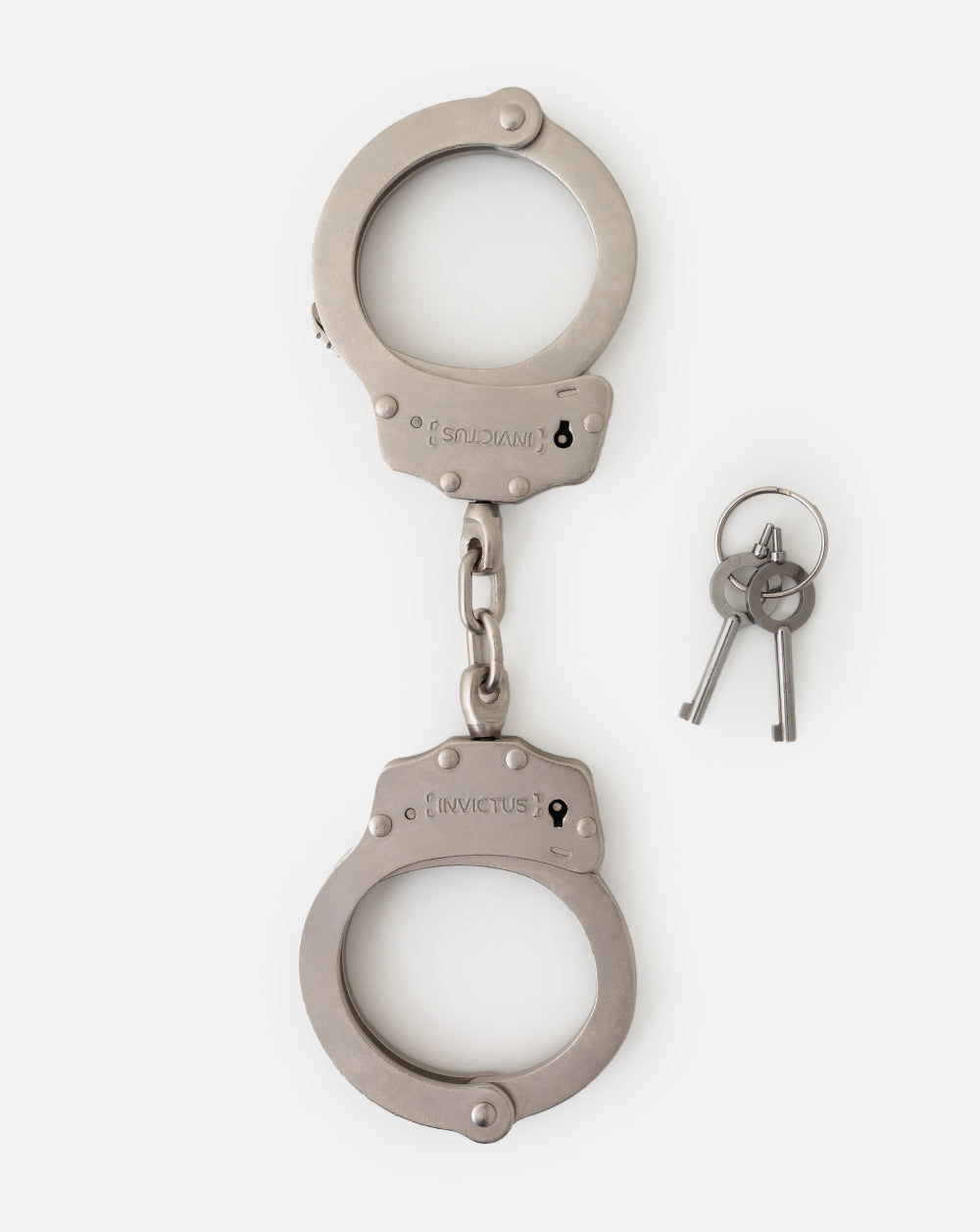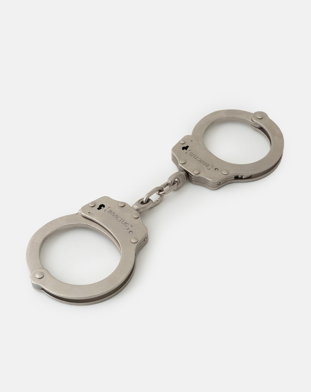 A Algema de Corrente INVICTUS é um modelo de algema de pulso que possui ligação através de elos de corrente e sistema de fechamento dentado por catracas. O modelo conta ainda com mecanismo de segurança para evitar lesão no uso, acionado pela parte traseira da chave do produto. Fabricada em aço carbono AISI 1020, tem tratamento da superfície preto ou niquelado fosco prata para adquirir a característica de antirreflexo. Acompanha duas chaves em aço carbono AISI 1020 na cor da algema