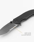 O canivete CUVIER BLACK foi projetado para entregar desempenho e confiança em cenários desafiadores. Sua lâmina em aço D2 no formato Tanto Point, com Cord Cutter, oferece a combinação ideal entre capacidade de perfuração, resistência da ponta e versatilidade no corte de materiais fibrosos.