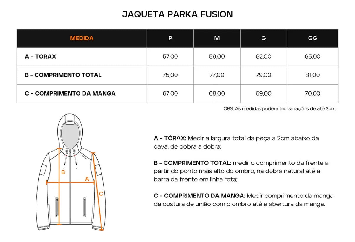 Escolha ideal para uso diário, seja no uso casual, profissional ou prática outdoor, a Jaqueta Parka Fusion é 100% impermeável e respirável mantém você seco e confortável em qualquer condição climática. Características: -Tecido 100% Poliéster - Impermeável; -Forro em mesh - Alta respirabilidade; -3 bolsos externos - 2 laterais e 1 superior esquerdo, com fechamento em zíperes e acabamento selados; -1 bolso interno com fechamento em tecido aderente; -Zíper principal selado com sobreposição de aba, com fechamento em tecido aderente; -Capuz fixo com regulagem e viseira estruturada - proteção água e neve; -Ilhós aplicados em áreas estratégicas para respirabilidade; -Barra com regulagem em elástico; -Regulagem de punho em tecido aderente; -Puxadores de zíperes personalizados; Cuidados: Para manter as características de fábrica da jaqueta INVICTUS, e garantir maior longevidade ao produto, lave-a à mão, sem utilizar alvejante e não a exponha a processos de lavagem a seco. Realize secagem à sombra e ao ar livre, não faça uso de secadoras. Não passe a ferro.