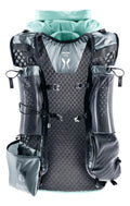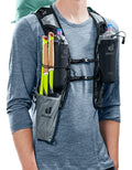 Seu design de “colete” (arnês) envolve bem o tronco, oferecendo mobilidade sem sacrificar apoio. A mochila inclui tiras peitorais removíveis, alças para bastões / piolets, anéis para capacete (Helmet Holder), apito de segurança e etiqueta SOS.