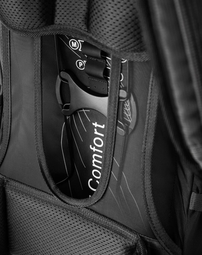Conforto e segurança também são características da peça, já que possui sistema de distribuição de altura ajustável, com ilustração indicativa de tamanho com engate rápido,também uma barrigueira com dois bolsos para guardar pequenos objetos, reduzindo o peso dos ombros.