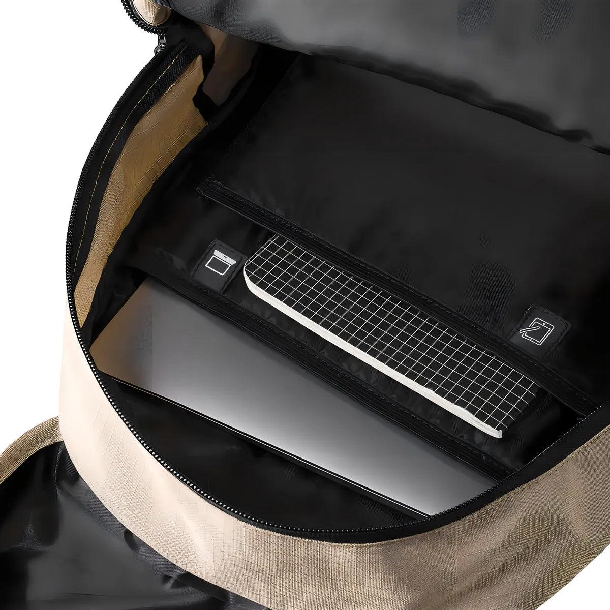 Ela possui um bolso frontal com zíper, com divisórias internas pensadas para gadgets eletrônicos, o que facilita organizar itens como celular, power bank, pen drive etc. Internamente, há um compartimento acolchoado para notebook de até 14″ e outro para tablet/Kindle de até 11″.