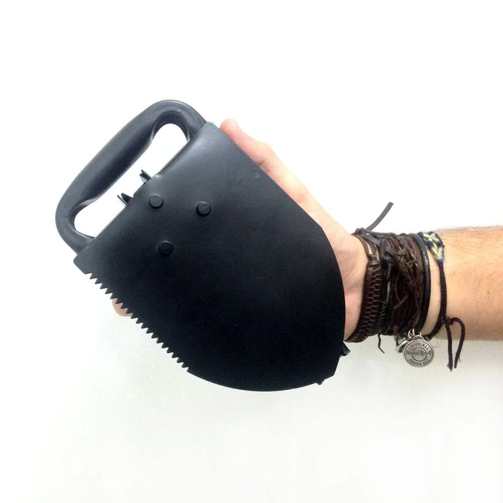 De um lado, temos uma pá, com uma das laterais serrilhada e a outra liso. Do outro, temos uma picareta, sendo todo o corpo do produto feito em aço revestido com pintura antioxidante.