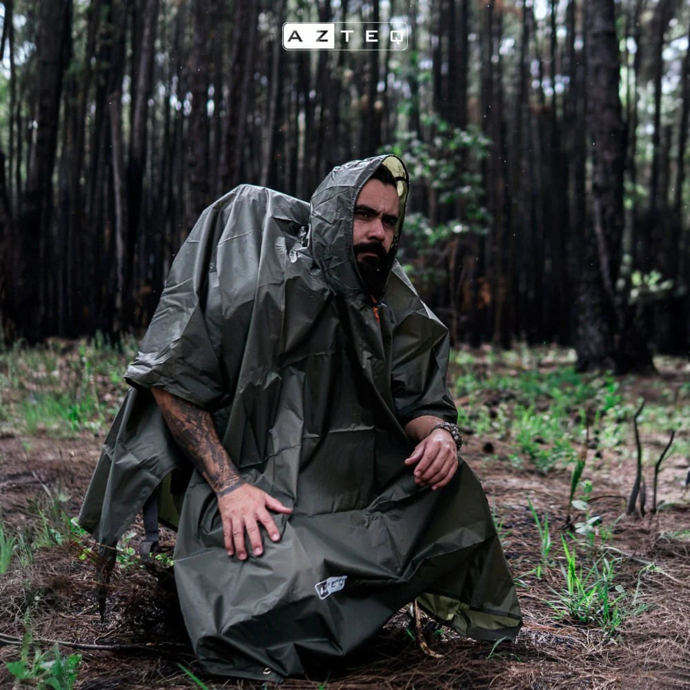 O Poncho Azteq Kocan é confeccionado em Nylon Ripstop 210T, um tecido extremamente resistente a rasgos e furos, com uma camada de impermeabilização que suporta até $2.000\text{mm}$ de coluna d'água. Suas costuras são totalmente seladas eletronicamente, garantindo que nem a chuva mais pesada penetre no equipamento.