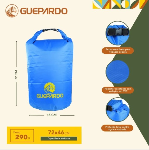 Com capacidade para 40 litros, é leve, prático e de fácil utilização. Para isso, basta abrir o saco, colocar os objetos, enrolar a parte superior e fechar com a fivela.